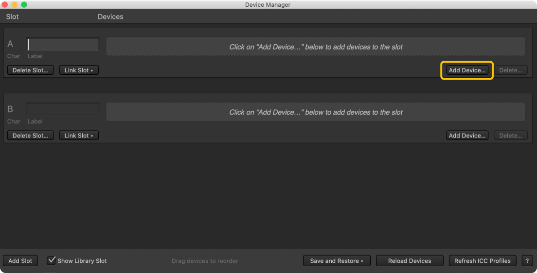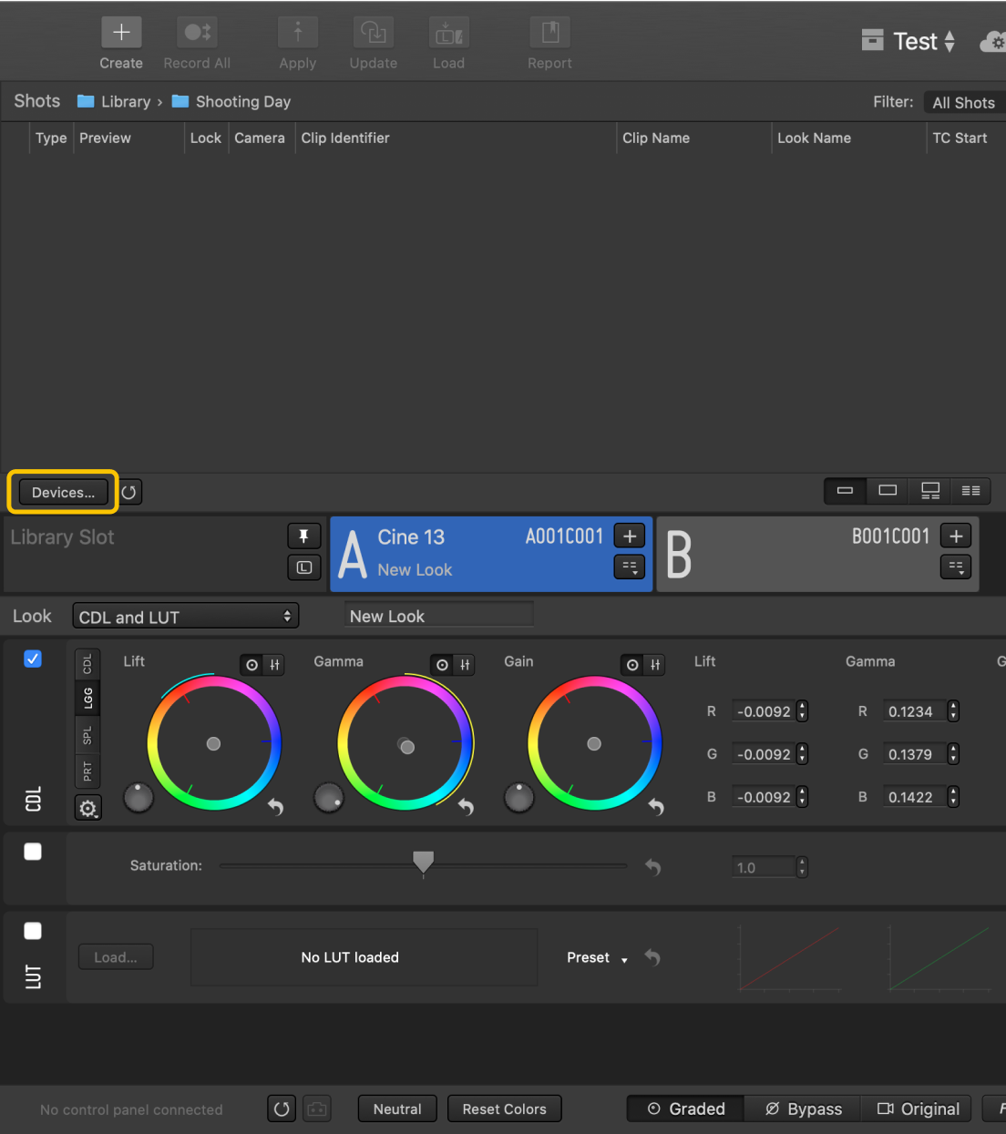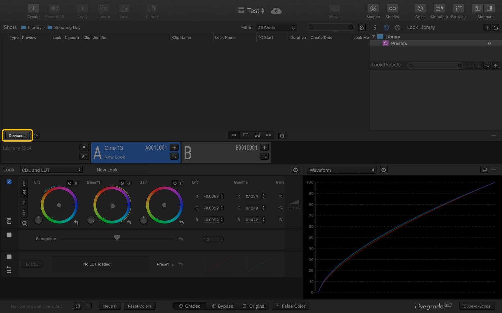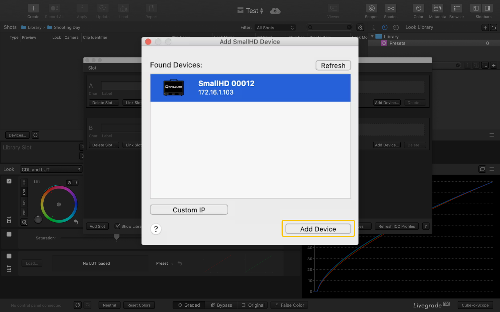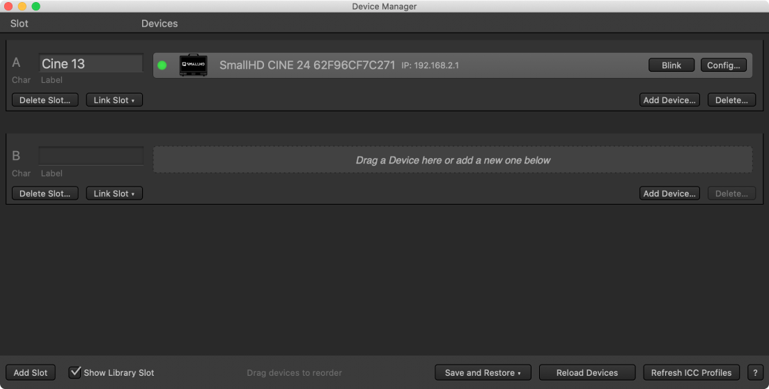 - When properly configured, a green button will appear next to the SmallHD device within the Device Manager, indicating an active connection between your computer and the monitor. Return to the main Livegrade window, and your SmallHD monitor will now be displayed as a device within the Grading Slot.