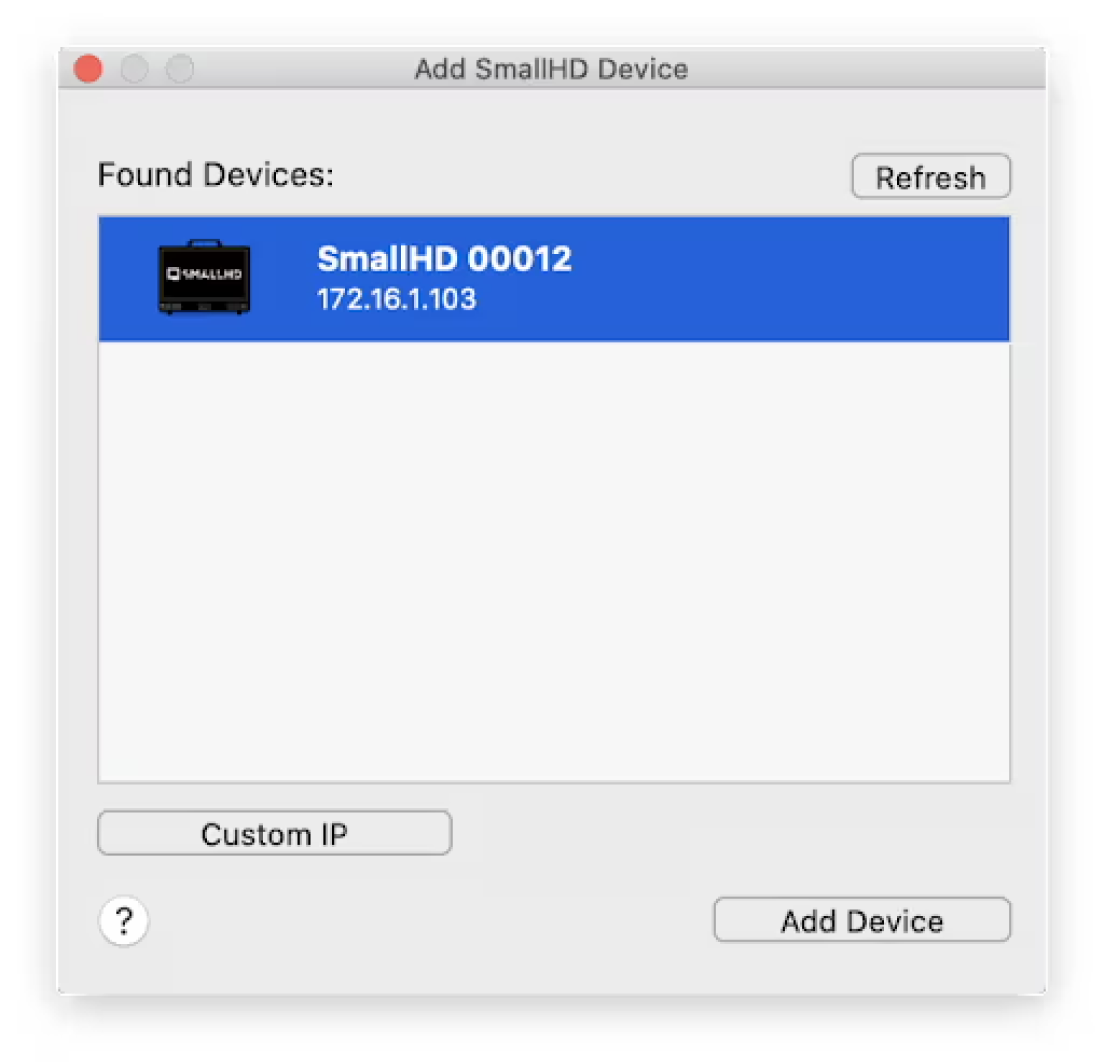 - The monitor should automatically appear within the list of devices. Select SmallHD, and when the configuration window appears, click Add Device