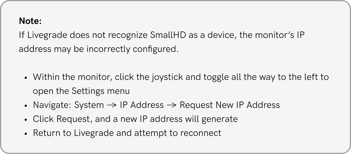 If the SmallHD device does not appear, manual configuration may be necessary: