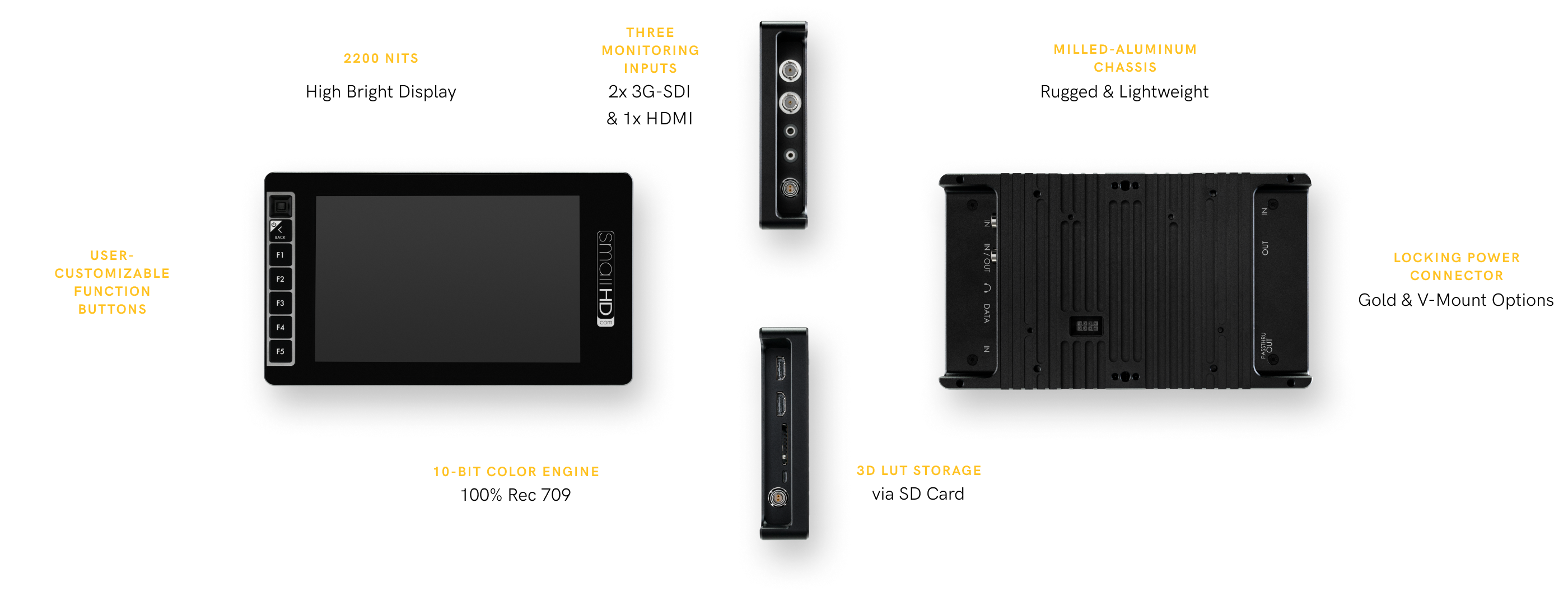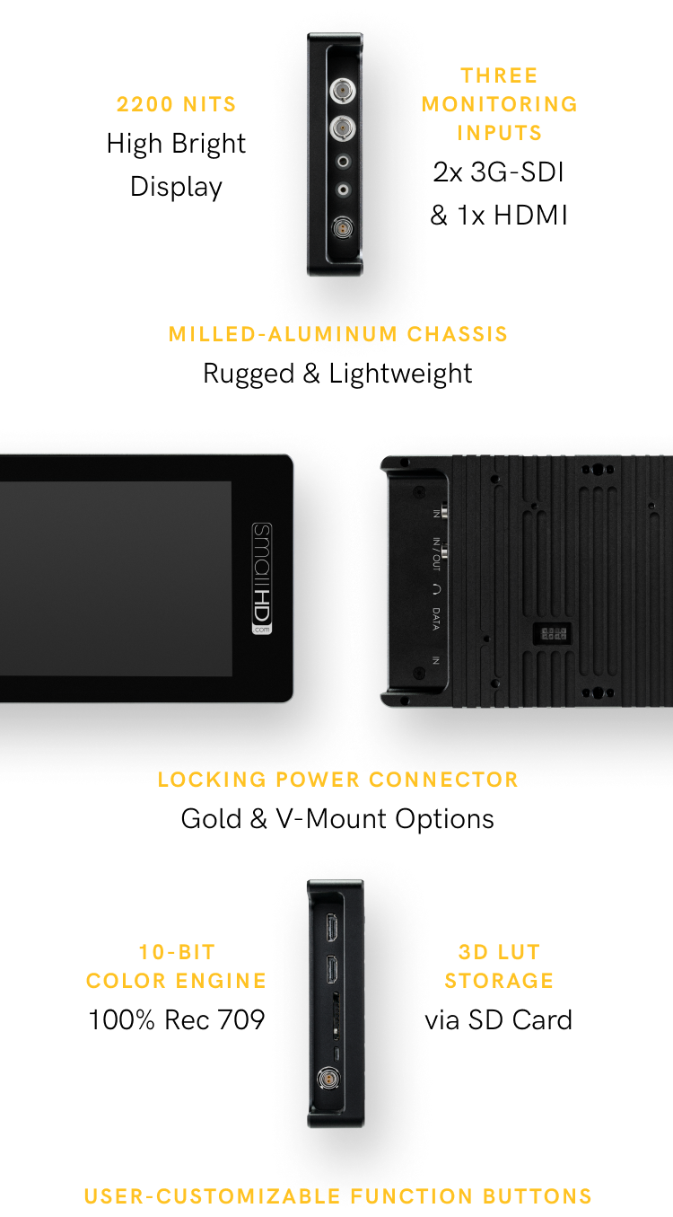 Utilize SmallHD’s dependable imaging software with personalized Page Profile, Frame Guides, Focus & Exposure Assist, Image Capture & Overlay, 3D LUT Control & Storage, Histogram, Vectorscope, 1:1 Pixel Zoom and more.