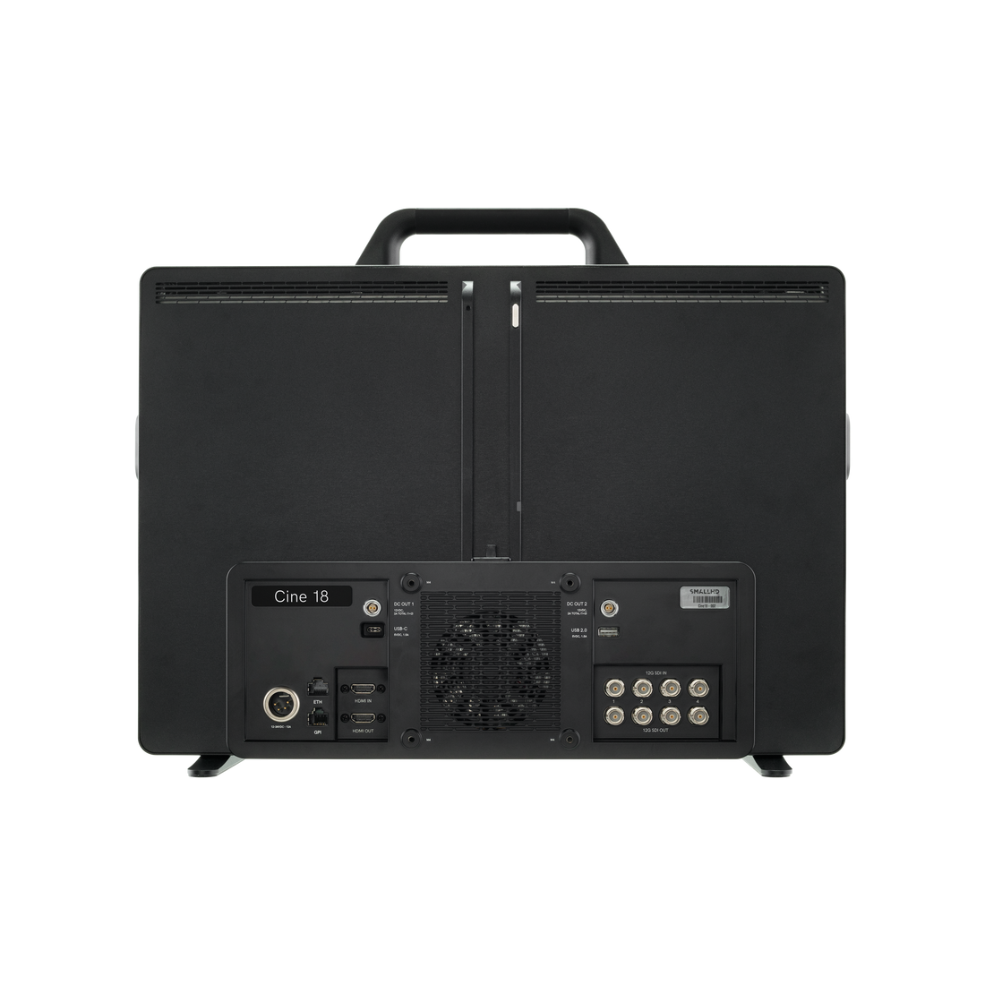 The Cine 18 features four 12G-SDI inputs and outputs, along with a single HDMI 2.0 input. The Unibody Smart Chassis includes a VESA mounting pattern and two 2-pin accessory power outputs. Hot-swappable dual battery inputs allow compatibility with Gold Mount or V-Mount battery plate attachments.
